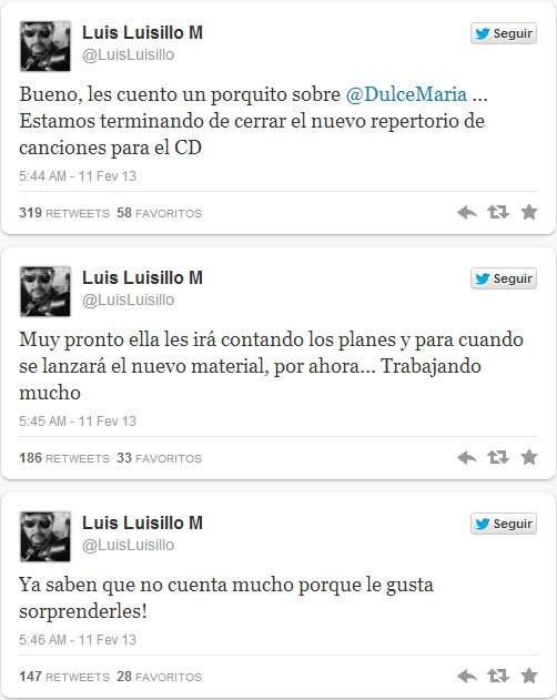 Na manhã da última segunda-feira (11/02) Luis Luisillo, o empresário de Dulce María, comentou em seu Twitter sobre a cantora, seus planos e seu novo disco. Veja: