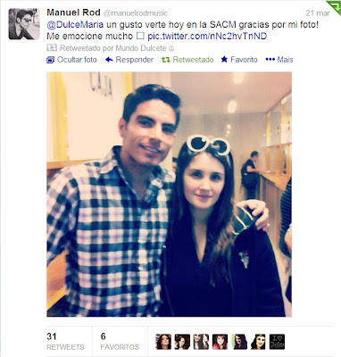 Dulce María esteve na SACM (Sociedad de Autores y Compositores do México) esta semana, o que parece para registrar novas músicas, onde ocasionalmente encontrou com o compositor Manuel Rod, quem publicou uma foto ao lado da cantora e ainda deu notícias sobre seu novo single aos seus seguidores no Twitter.