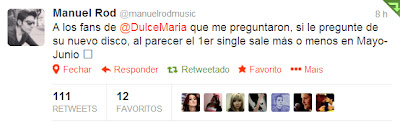Conforme os tweets de Manuel Rod, o novo single de Dulce María deve sair em meados de Maio e Junho deste ano, é o que a mesma teria comentado com ele durante o encontro informal.